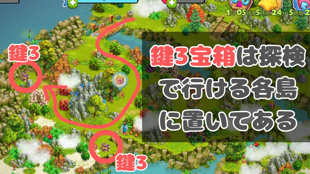 探検島は次の島を開放すると古いものから消えて入場できなくなる。もし島内に埋まった宝箱や倒木があれば必ず掘り出しておこう。中盤以降の建築で要求されるレア素材が手に入る。