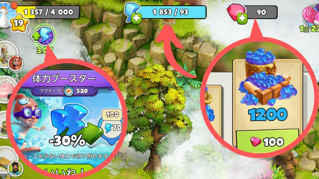 イベント島は取得経験値が低いので体力をたくさん使う割に全然レベルが上がらない。最初の2~3か所の門を開けて体力宝箱を取って撤退する。深入りしすぎると獲得体力<消費体力になってしまう。
