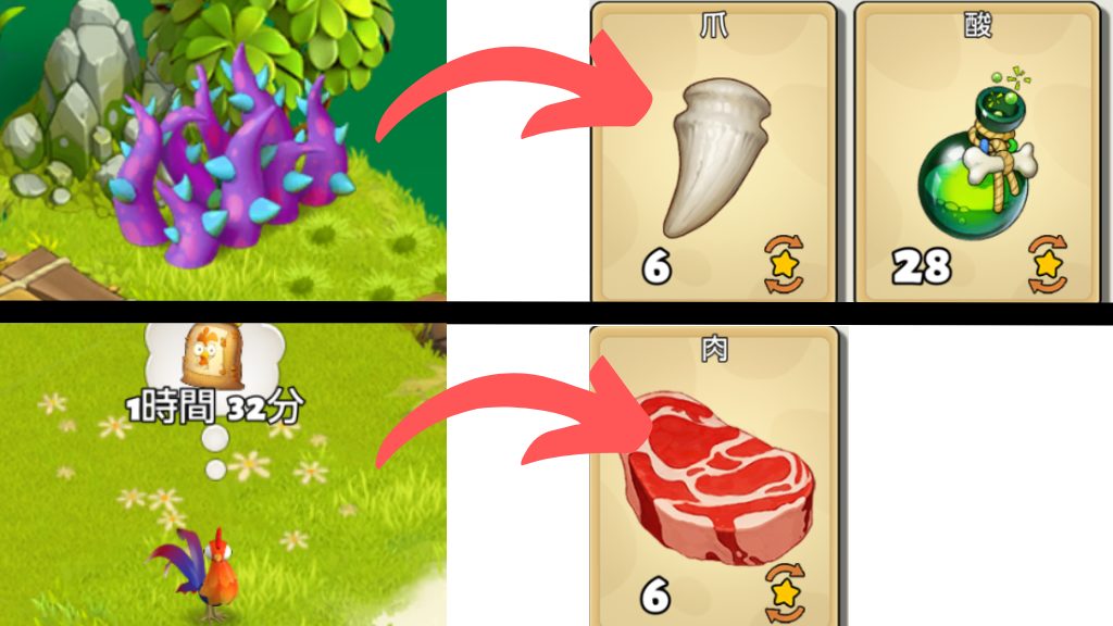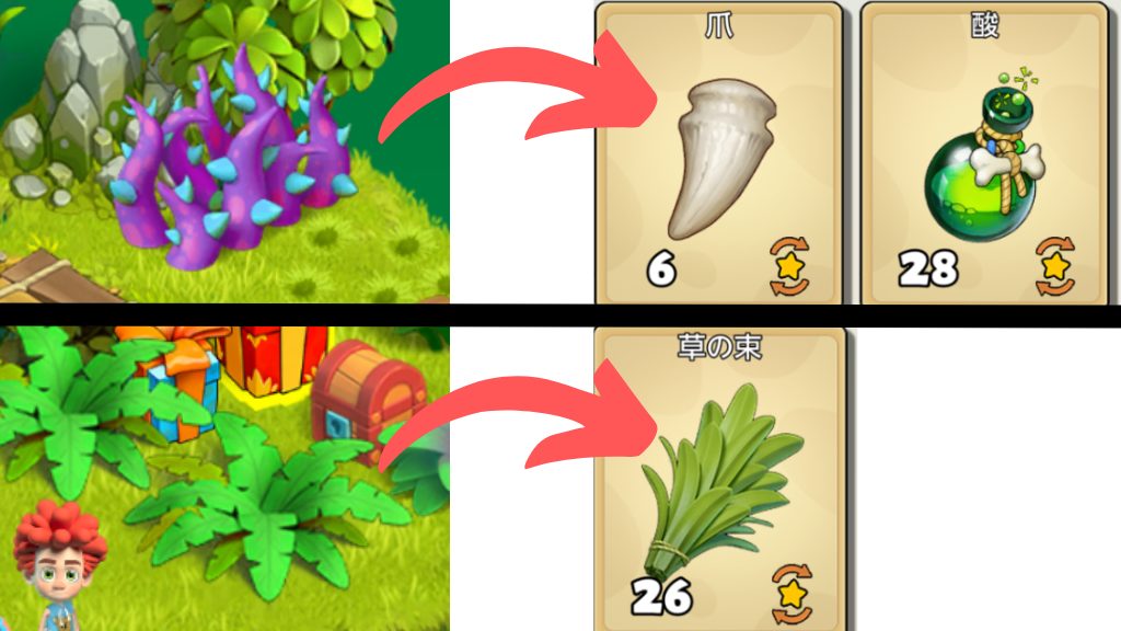 棘(ホーム島に生えてない)から出てくる爪や酸を大量に消費する場面が来る。草の束も大量に必要だがホーム島では草が枯渇するので探検島から取ってくる。