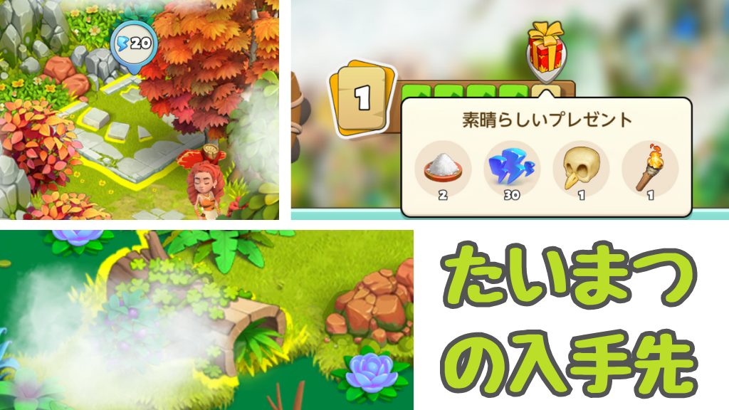 たいまつは探検島をより先に進めないと手に入らない。バウンシー島の正方形の石畳?から、レッド島ではまとまった数手に入る。倒木からは確率で0~2本出る。足りない分はシャーマンと交換する。