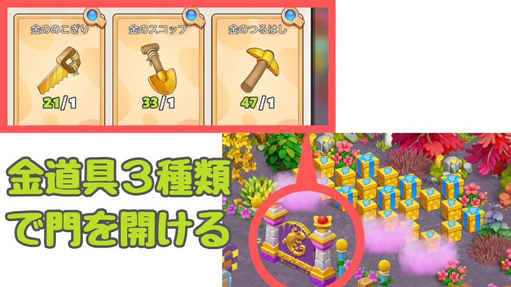 イベント島の再序盤には体力宝箱がある門が置かれていることが多い。門を開ければ大量の体力ボックスが手に入る。金道具は先ほど解説した鍵付き宝箱に入ってる。