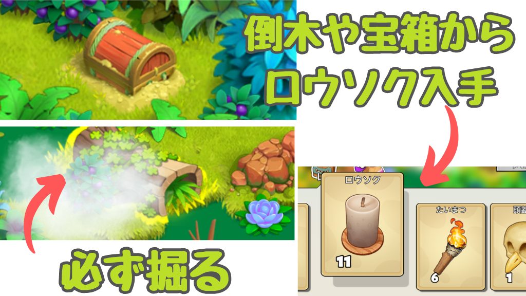 ロウソクはカバ島で手に入りやすい。宝箱や倒木をきちんと処理していればシャーマンと交換せずとも必要分手に入るとは思うが、もし足りなければ交換を。
