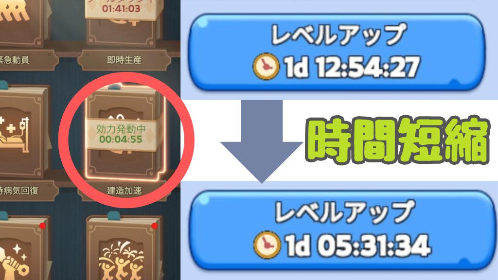 5分間建築時間を20%短縮できる。満足度を消費するので序盤は不要だが大溶鉱炉が1日以上かかるようになったら使うと良い。レベル17くらいから23まで毎日発動しても足りる。